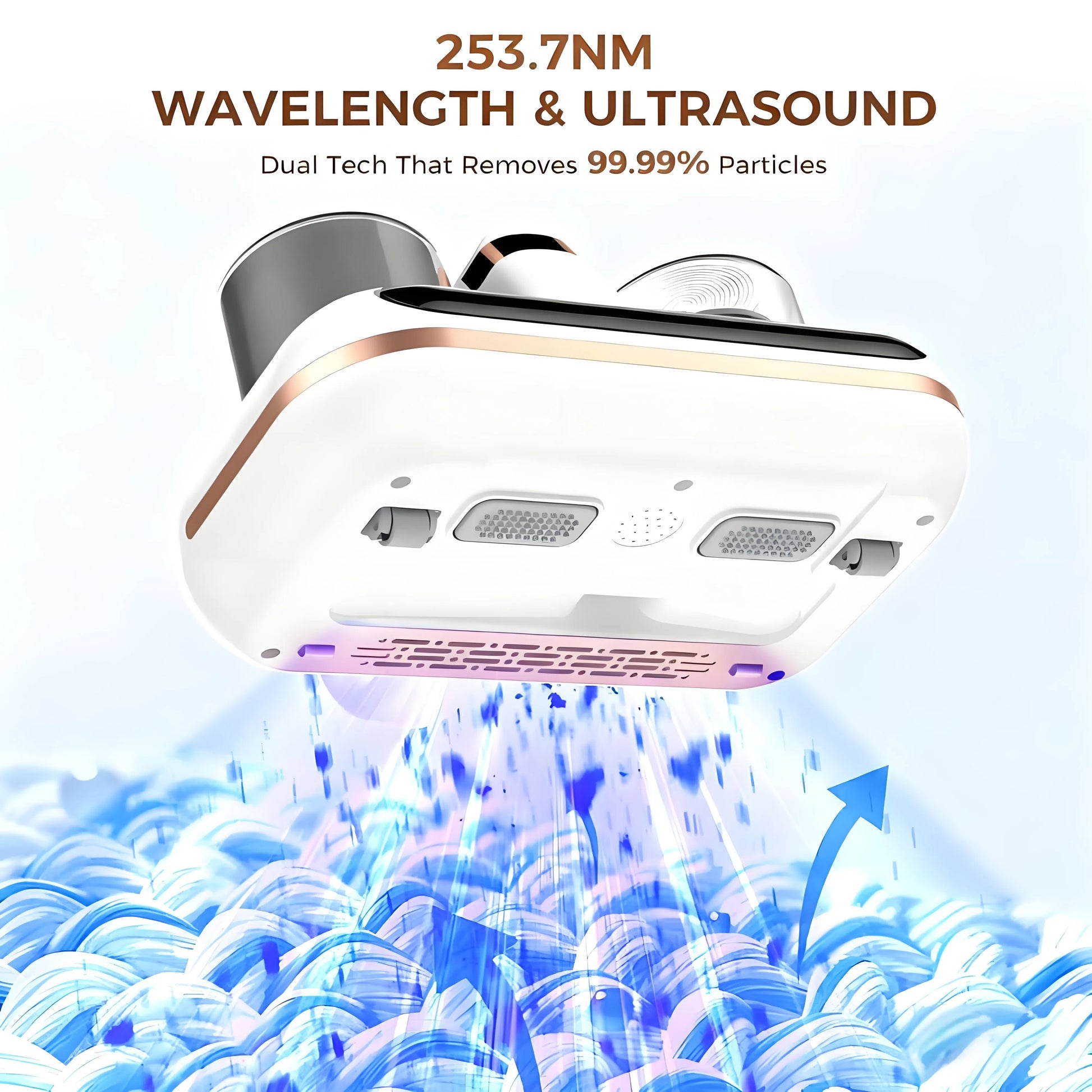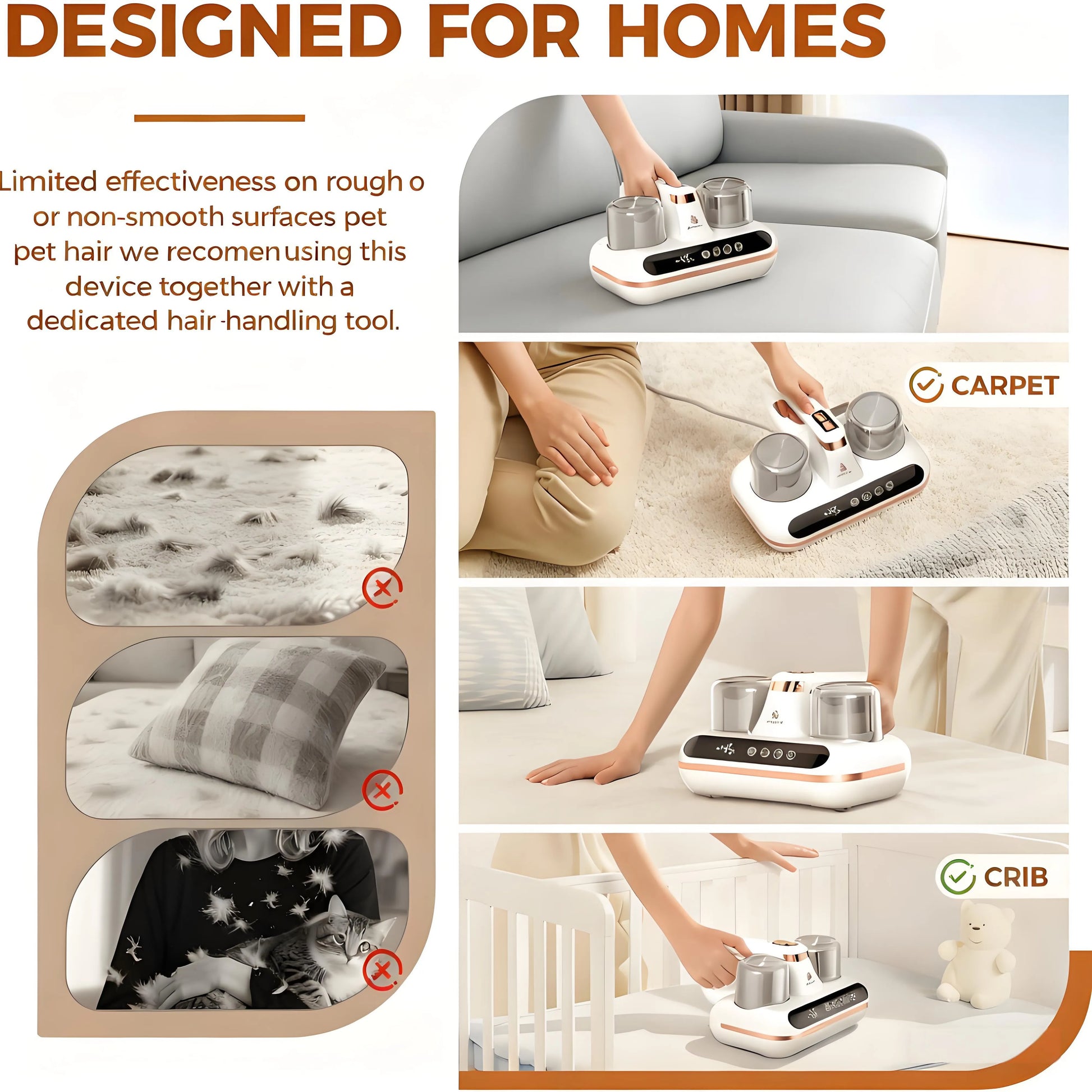 Adopt a scientific 5-in-1 cleaning system to achieve the best mattress cleaning experience: 253.7nm UV-C Light: Physically eliminates dust mites and bacteria without chemicals, safe for babies and pets.Physical Ultrasound: Breaks down dust mite cells with high-frequency vibrations, enhancing dust mite removal efficiency.Powerful High-Frequency Tapping: Vibrates 12,000 times per minute to shake loose deep-seated dust and dust mites from mattress fibers.Hurricane Deep Breath: Creates cyclonic air flow to capture dislodged dirt and prevent it from escaping.Super Suction Power: Immediately sucks up the shaken dirt and dust mites, ensuring no residue. This multi-dimensional cleaning method comprehensively purifies your mattress, creating a healthy sleeping environment.